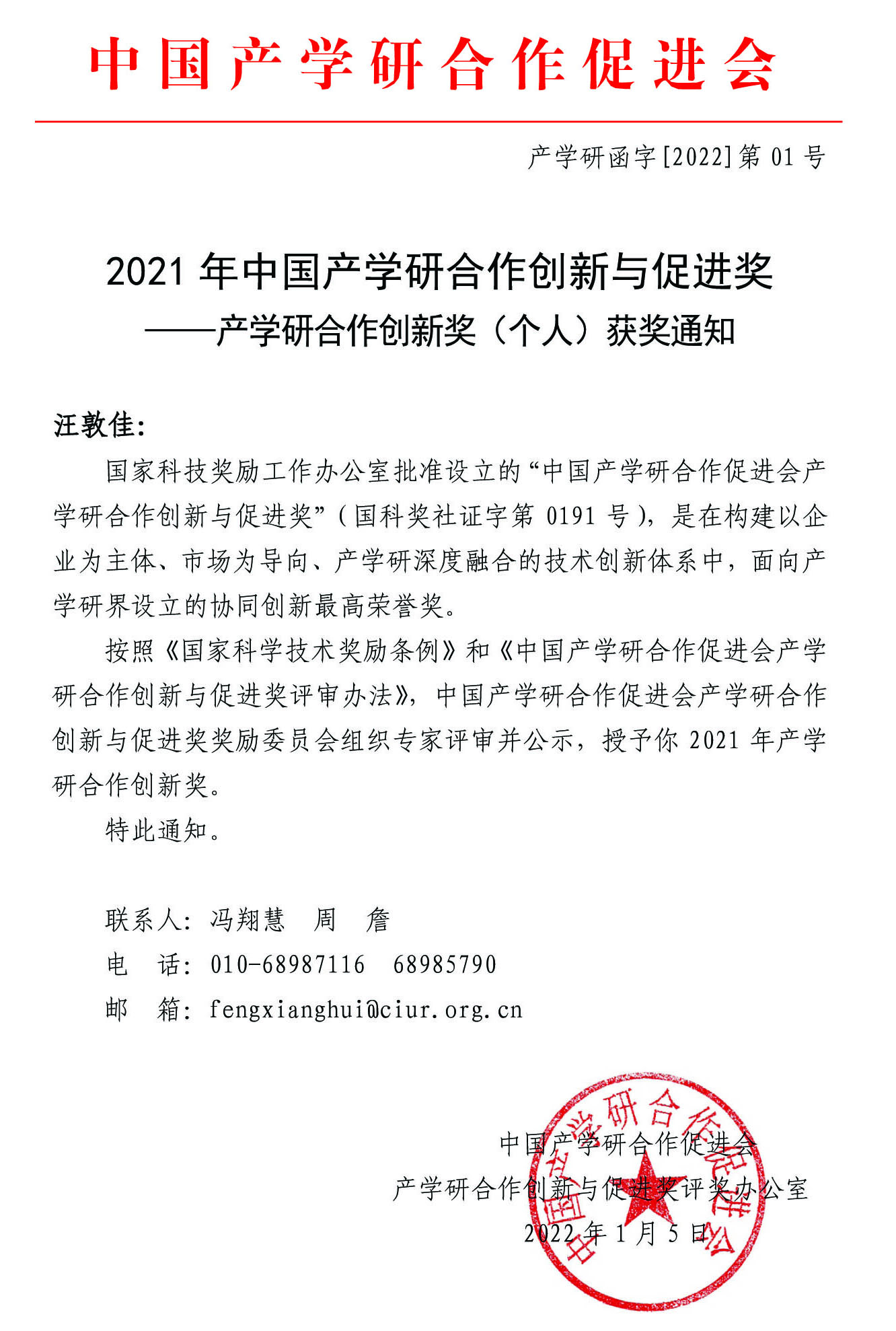 近日,中国产学研合作促进会公布了“2021年中国产学研合作创新与促进奖”评选结果,公司汪敦佳教授荣获“2021年中国产学研合作创新奖(个人)”。