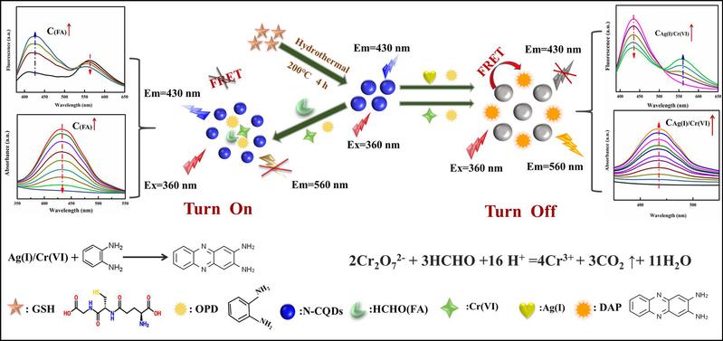 长期以来,重金属污染一直是影响中国食品质量和安全的主要原因之一。近日,吴一微教授团队以谷胱甘肽为前驱体,通过简单的一步水热法合成了量子产率高达21.4%的氮掺杂碳量子点(N-CQDs),并结合邻苯二胺(OPD)建立了用于快速检测Cr(VI)、Ag(I)和HCHO的荧光和吸光度双模式可视化分析新方法。在Cr(VI)/Ag(I)的作用下,OPD被氧化为在560 nm有新荧光发射峰的2,3 -二氨基吩嗪(DAP)。由于荧光共振能量转移效应,DAP有效猝灭N-CQDs在430 nm的荧光,通过“一升一降”构建了比率荧光传感平台;同时,DAP在432 nm处吸光度的增加也实现了比色分析;此外,由于甲醛在弱酸性介质中抑制Cr(VI)对OPD的作用,该传感平台还能用于可视化检测甲醛。本工作所构建的双模式可视化分析新方法展现了出色的灵敏度和使用的便捷性,并成功应用于环境水、红酒、冻鸡和冻虾等实际复杂样品中Cr(VI)、Ag(I)和HCHO的灵敏检测。