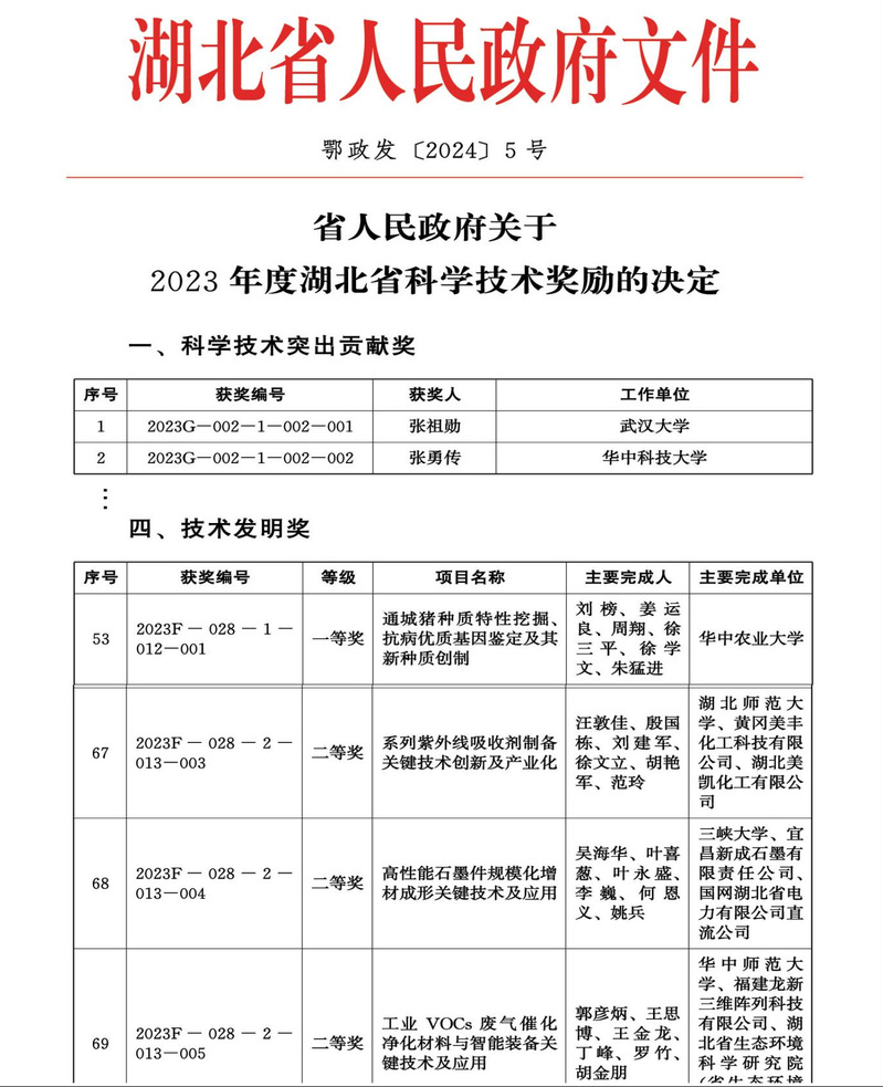 近日,湖北省人民政府印发《关于2023年度湖北省科学技术奖励的决定》(鄂政发〔2024〕5号),公司汪敦佳教授团队主持完成的“紫外线吸收剂制备关键技术创新及产业化”获湖北省技术发明奖二等奖。本次授予湖北省科学技术突出贡献奖、青年科技创新奖、自然科学奖、技术发明奖、科学技术进步奖和科技型中小企业创新奖共337项,其中技术发明奖28项。