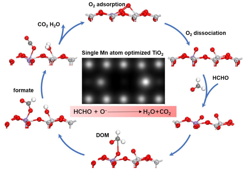 本工作中,单原子Mn优化的TiO2材料(Mn/TiO2)表现出优异的甲醛消除性能。单原子Mn取代了{001}面暴露的TiO2表面Ti5c原子,提供了新型活化位点来解离活化O2。因此,在空气环境中Mn/TiO2实现了100 %的甲醛消除率以及高达99.6 %的甲醛矿化率,而纯TiO2仍残留了0.28 ppm甲醛,远超过我国甲醛浓度限制(0.06 ppm),Mn/TiO2性能也优于许多近期报道的TiO2基材料。基于DFT、EPR、TOF-SIMS以及FT-IR分析,本文性能突破归因于单原子氧负离子(O-)的高效选择性生成。单原子Mn促进了局部电子和光生电子持续占据O2的π2p*反键轨道,从而诱导了吸附态O-的选择性生成,进一步有利于与甲醛反应生成关键中间体DOM,最终实现甲醛近100 %选择性转化为CO2和H2O。该研究揭示了O-驱动的光催化甲醛氧化反应机制,为设计单原子介导的O-氧化体系提供了重要参考。