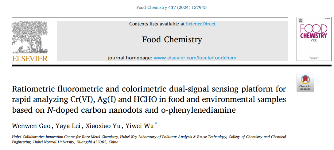 研究提出了一种基于氮掺杂碳量子点(CDs)和邻苯二胺(OPD)的双信号传感检测新方法,可高效检测Ag(I)Cr(Ⅵ)HCHO,其优点为通过简单、环保的过程合成了具有良好光学和化学稳定性的CDs;具有比例荧光和比色双模式,使检测结果更加可靠;基于CDs的双策略在样品中具有良好的Ag(I)Cr(Ⅵ)HCHO检测潜力。该成果于202311月发表于中科院SCI大类一区期刊Food ChemistryIF8.8,2020级硕士研究生郭雯雯为论文第一作者,吴一微教授通讯作者,bv1946伟德为论文唯一通讯单位。