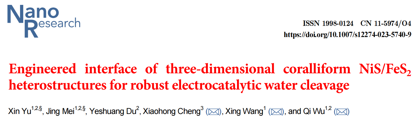 [成果27] 三维珊瑚状NiS/FeS2异质结构的界面工程用于高效的电催化水裂解