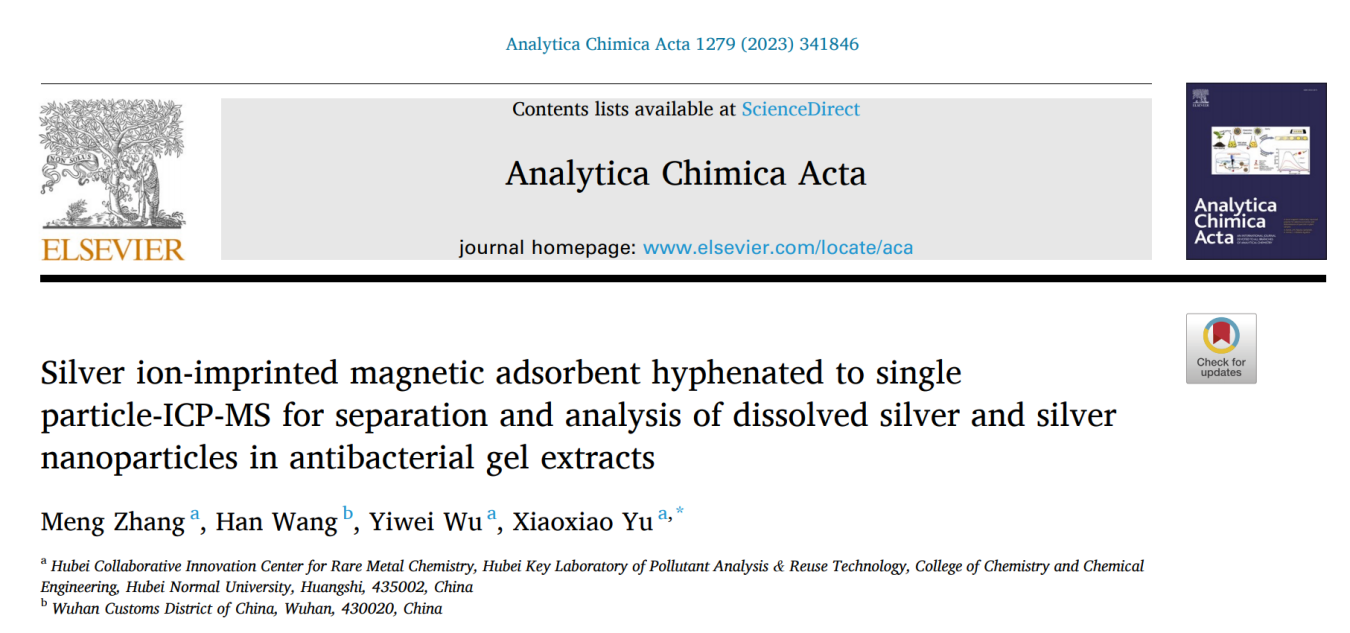 【成果16】银离子印迹磁响应吸附剂与单颗粒ICP-MS联用分离分析抗菌凝胶中溶解态银及纳米银