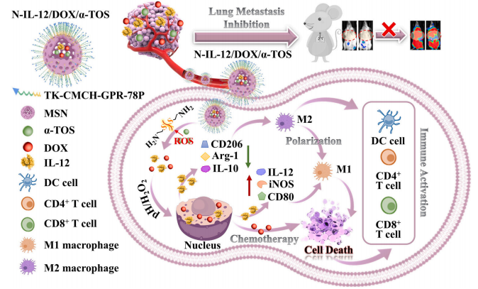 化疗后肿瘤的免疫力较弱可能会导致肿瘤转移和进展。因此,克服化疗引起的明显免疫缺陷困境,有望抑制肿瘤转移。该研究利用硫酮(TK)键连接的中空介孔二氧化硅纳米粒子(HMSNs)装载阿霉素(DOX)、白介素-12(IL-12)和α-生育酚琥珀酸酯(α-TOS),涂覆羧甲基壳聚糖(CMCH)用于把控化疗药物的释放,并表面功能化葡萄糖调节蛋白78结合肽以靶向癌细胞,制备了N-IL-12/DOX/α-TOS纳米系统。无药物的纳米粒子对4T1细胞和RAW264.7巨噬细胞均显示出良好的生物相容性。N-IL-12/DOX/α-TOS能够在肿瘤微环境(TME)中通过pH和H2O2触发实现IL-12、DOX和α-TOS的局部释放。此外,N-IL-12/DOX/α-TOS的联合疗法显著提高了抗肿瘤治疗效果,通过促进肿瘤相关巨噬细胞(TAM)极化为具有杀瘤活性的M1表型来增强免疫反应,并减少了肺转移和副作用。N-IL-12/DOX/α-TOS展现了作为一种有前景的策略,结合化疗和局部巨噬细胞调节免疫疗法用于抗肿瘤治疗。