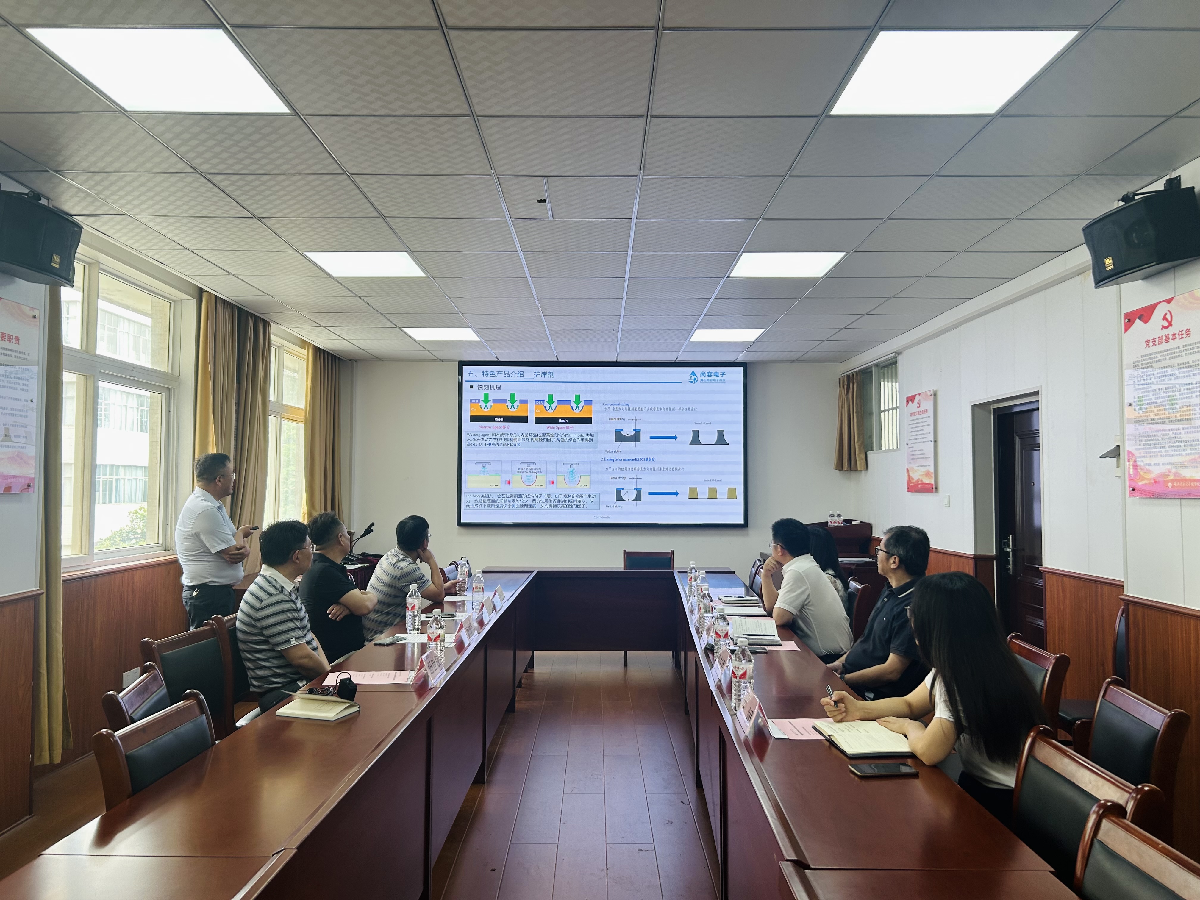 5月21日,黄石尚荣电子科技有限公司董事长周诚勇、总经理卫建权一行来学院考察交流。该公司是一家从事电子专用材料研发、技术服务、技术开发为主要业务的科技型企业,主要生产为印刷电路板(PCB)生产过程中必需的各类溶液。该公司一行参观了学院大型仪器设备实验室和微通道转化技术校企合作实验室。在座谈交流环节,党委书记罗鸿飞介绍了学院基本情况,经理殷国栋介绍了近年校企合作与成果转化有关情况。公司负责人介绍了黄石尚荣电子基本情况和产品有关介绍,表示期待与学院加强技术研发、员工培训、实习就业及共建校企合作实验室等方面合作。党委副书记吴天真、副经理周兴旺及王娟博士参加座谈交流。