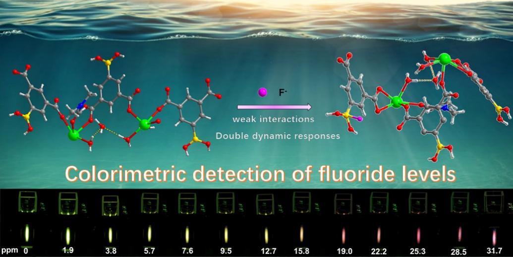 由于长期饮用污染水,慢性氟毒性已至少在全球25个国家出现,对人类健康构成巨大威胁。因此,有必要为公共饮水安全开发一种可以快速便捷可视化检测氟离子的方法。在这项工作中,闵辉博士合成了一系列含有丰富氟离子识别位点的混合镧系金属-有机框架,即{[EuxTb2−x(BIPA)3(DMF)(H2O)3]·2DMF·3H2O}n (H2BIPA = 5-硼酸间苯二甲酸; x = 0, 0.12, 0.28, 0.30, 0.68, 1.04和2分别代表合成的晶体化合物1-7),用于便捷直观地检测江水中的氟离子含量。通过对化合物的成分和发光性能进行系统优化,可以获得高灵敏且检测范围宽的氟离子可视化传感材料。利用单晶X-射线衍射和瞬态荧光技术清楚地揭示了氟离子与镧系金属-有机框架之间罕见的双重动态传感过程。