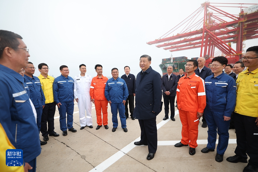5月22日至24日,中共中央总书记、国家主席、中央军委主席习近平在山东考察。这是22日下午,习近平在日照港亲切慰问港口科技工作者、运营人员、航运人员。 新华社记者 鞠鹏 摄