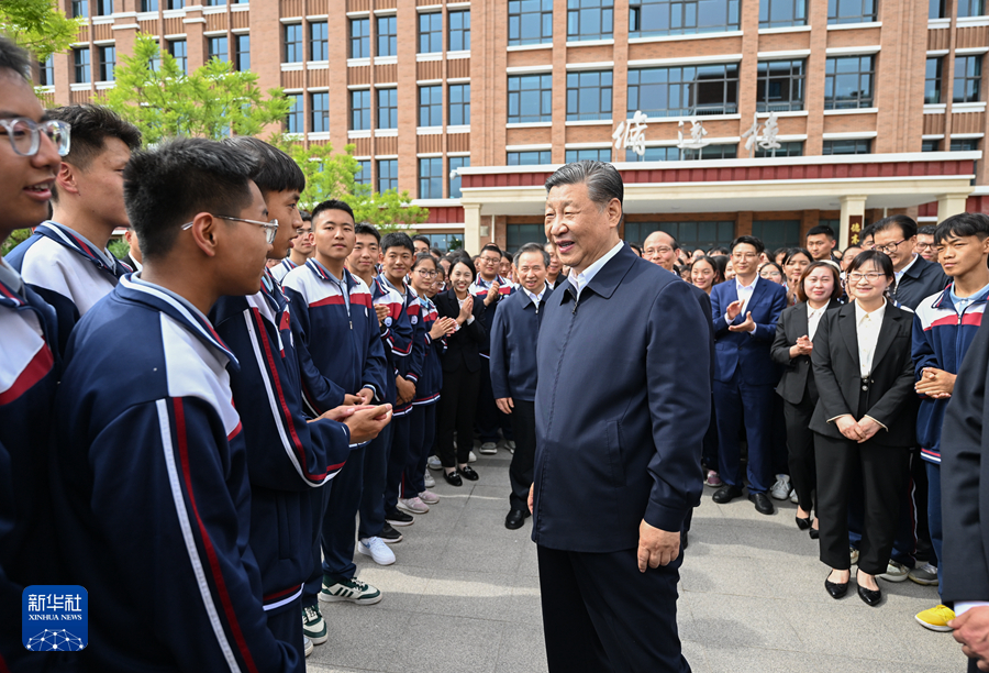 6月18日至19日,中共中央总书记、国家主席、中央军委主席习近平在青海考察。这是18日下午,习近平在果洛西宁民族中学考察时,同师生们亲切交流。新华社记者 谢环驰 摄