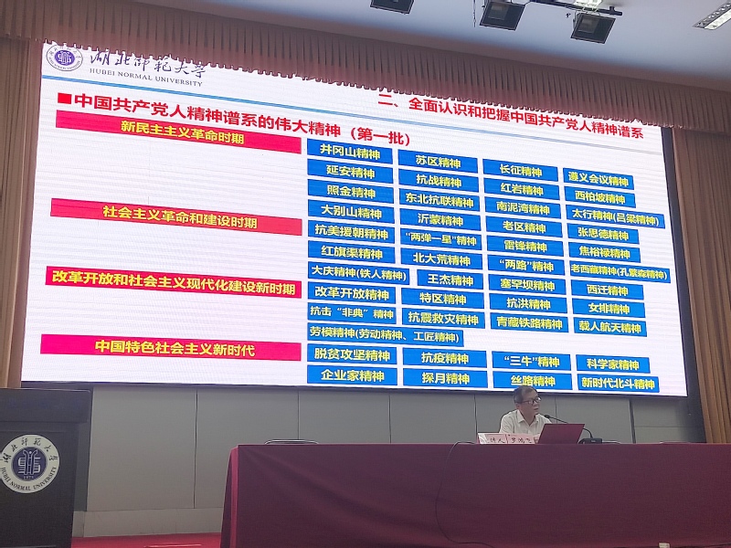 罗鸿飞在授课时指出,一百年前,中国共产党的先驱们创建了中国共产党,形成了坚持真理、坚守理想,践行初心、担当使命,不怕牺牲、英勇斗争,对党忠诚、不负人民的伟大建党精神,这是中国共产党的精神之源。伟大建党精神是中国共产党特质的生动写照。一是要深刻领会习近平总书记关于中国共产党人精神谱系的重要论述。他强调,习近平总书记高度重视传承和弘扬共产党人的精神谱系,作出一系列系统而全面、具体而深刻的重要论述,进一步阐明了党的一系列精神的重要意义和丰富内涵,把我们党关于党的精神谱系的理解提升到新的历史高度。这些重要论述包括强调不忘初心、牢记使命,革命精神是本色;强调党的革命精神是最为宝贵的“营养剂”,是增强党的治国理政本领的重要法宝;强调革命精神是强国之魂、兴党之魂;对党的历史上具有全局性重大影响的革命精神进行更加系统地阐释、作出富有创造性的概括。二是要全面认识和把握中国共产党人精神谱系。他指出,中国共产党的革命精神都是在一系列重大历史事件中锤炼并经过诸多历史人物的伟大实践淬炼而成的。他逐一简要讲解了新民主主义革命时期、社会主义革命和建设时期、改革开放和社会主义现代化建设新时期、中国特色社会主义新时代四个时期的第一批中国共产党人精神谱系的伟大精神。三是要充分认识党的革命精神的历史价值和时代价值。他指出,共产党人精神谱系是中国共产党人的灵魂和根脉,是党与生俱来的红色基因,是党的传家宝,始终是激励中国共产党人不断前进的强大精神动力。当代中国青年生逢其时,施展才干的舞台无比广阔,实现梦想的前景无比光明。我们要坚定不移听党话、感党恩、跟党走,怀抱梦想又脚踏实地,敢想敢为又善作善成,立志做有理想、敢担当、能吃苦、肯奋斗的新时代好青年。