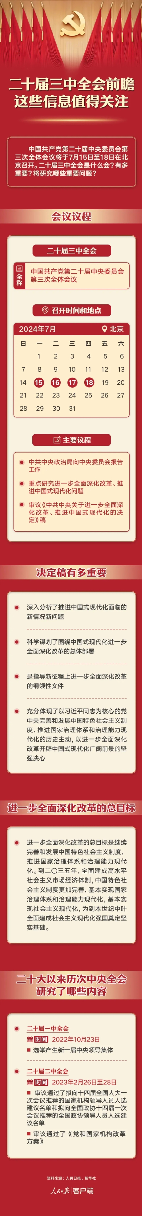 中国共产党第二十届中央委员会第三次全体会议15日上午在北京开始举行。中央委员会总书记习近平代表中央政治局向全会作工作报告,并就《中共中央关于进一步全面深化改革、推进中国式现代化的决定(讨论稿)》向全会作了说明。