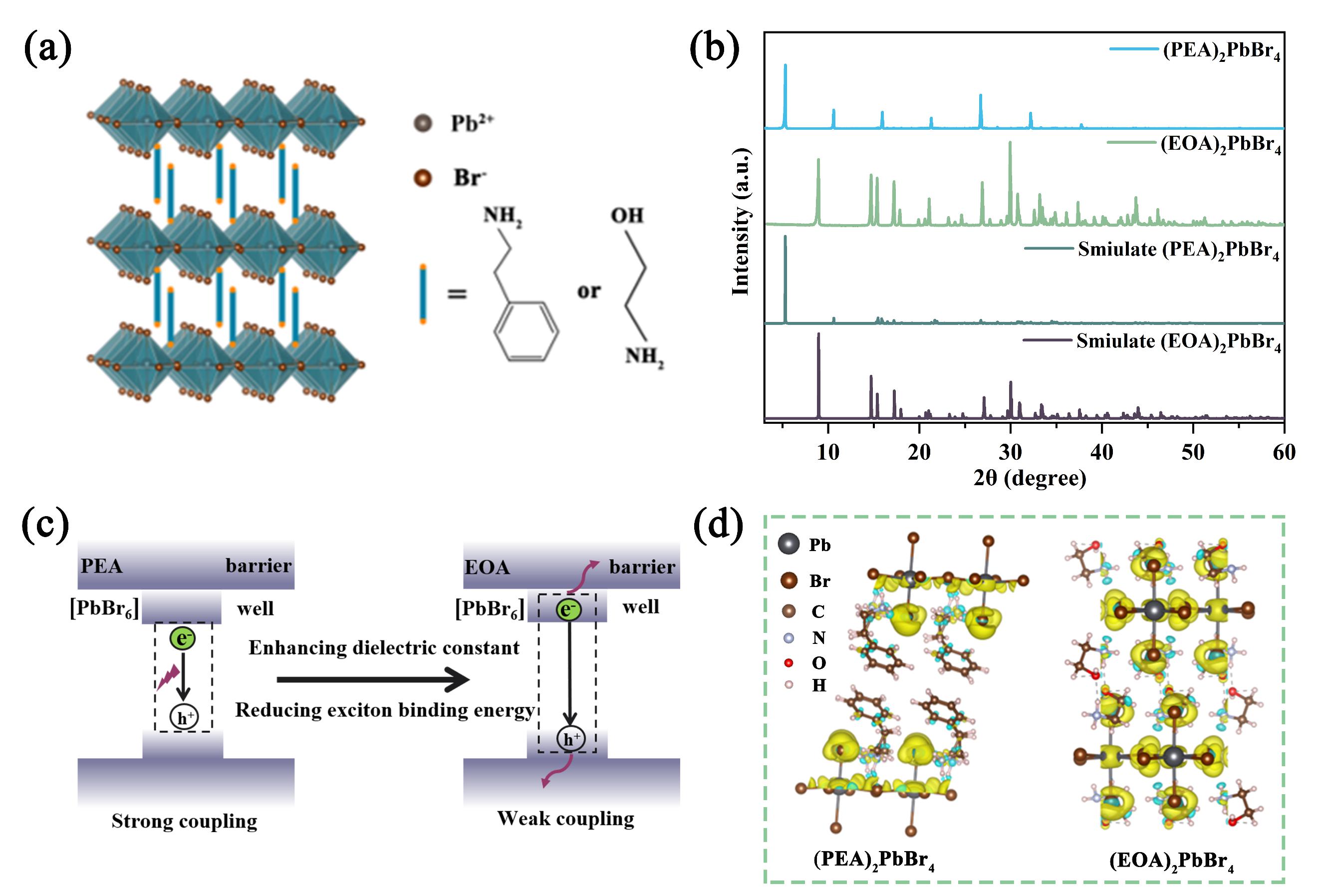 图片说明:与(PEA)2PbBr4相比,(EOA)2PbBr4具有的较小激子结合能,促进电子和空穴的分离,产生更多自由载流子