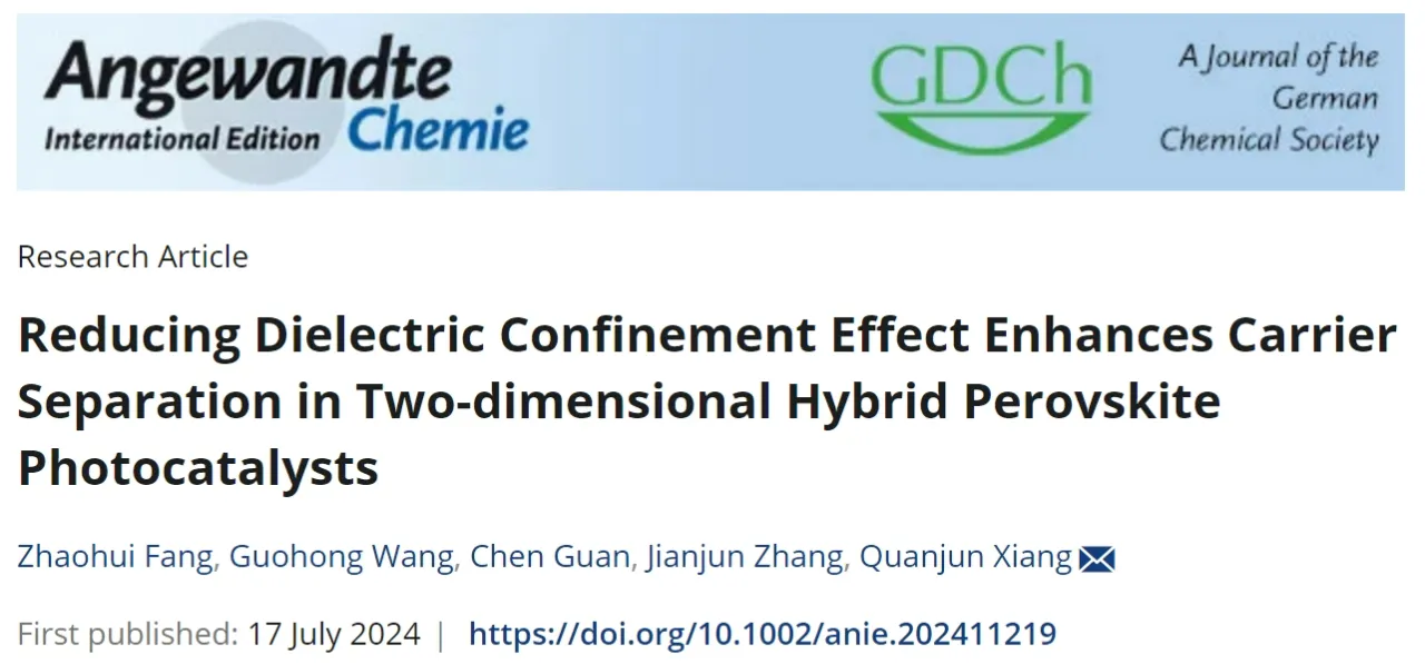 近日,公司王国宏教授与电子科技大学向全军教授及中国地质大学(武汉)张建军博士等合作,在国际知名期刊Angew. Chem. Int. Ed.(《德国应用化学》)上在线发表题为“Reducing Dielectric Confinement Effect Enhances Carrier Separation in Two-dimensional Hybrid Perovskite Photocatalysts”(降低介电限域效应以促进二维钙钛矿复合光催化剂电荷分离)研究性论文。公司王国宏教授、电子科技大学向全军教授及中国地质大学(武汉)张建军博士为论文共同通讯作者,电子科技大学、bv1946伟德、中国地质大学(武汉)分别为论文第一、第二、第三通讯单位。Angew. Chem. Int. Ed.由Wiley出版社1962年创办,是化学领域的权威期刊,SCI中科院大类一区TOP期刊,最新影响因子为16.6。