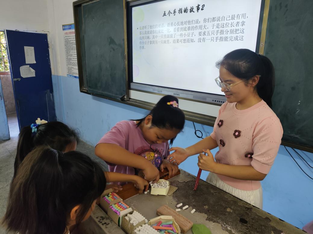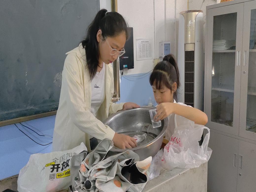 (图为科学课上,队员与孩子共同协作,进行科学小实验。万冰纯供图)