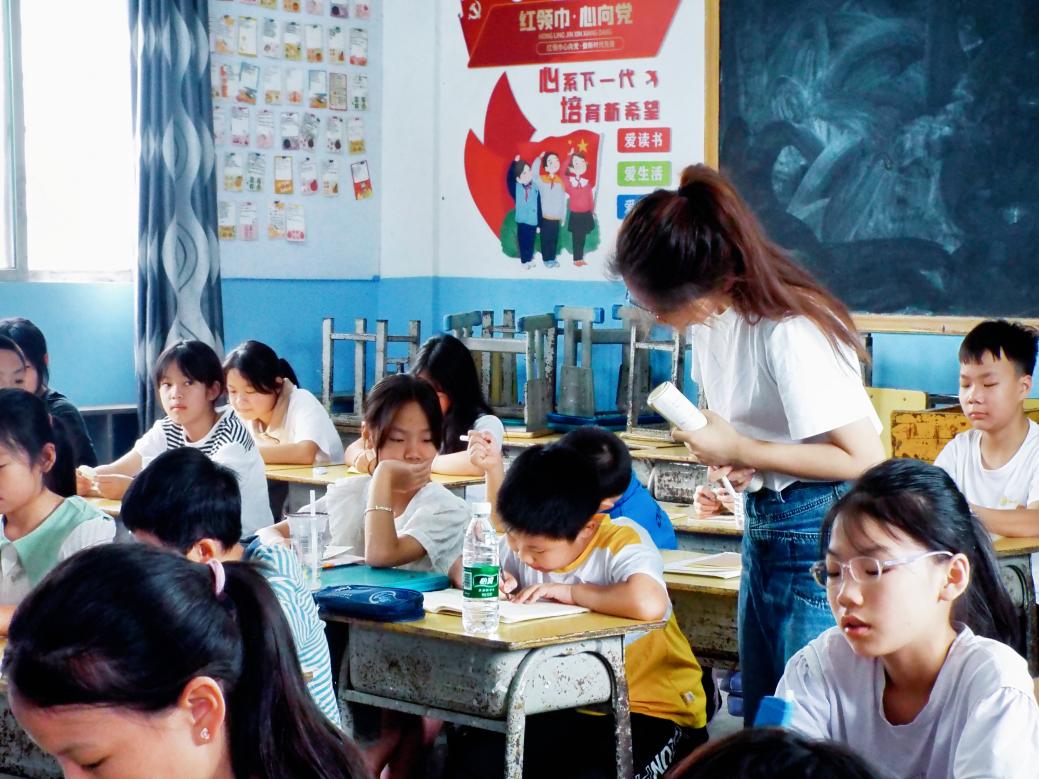 (图为英语课上,队员为孩子们答疑解惑。罗雨欣供图)