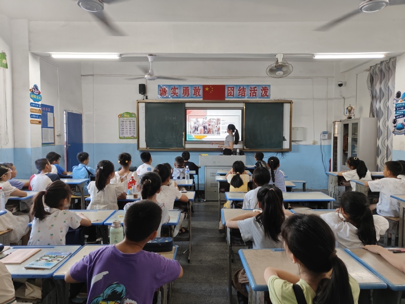 历史课上,队员将中国优秀传统文化引入课堂,向孩子们介绍了“京剧”“四大发明”“秦始皇兵马俑”等我国优秀传统文化,引导孩子们树立文化自信,以传统文化立德;思想品德课上,队员借助多媒体技术向孩子们介绍了多位令人敬佩、值得学习的优秀人物,生动讲述了黄文秀同志、张桂梅老师及袁隆平院士等的先进事迹,引导孩子们寻找榜样,以时代楷模领德;心理健康课上,队员们通过“缝口袋的人”“打翻的牛奶”“情绪小怪兽”等一个个生动形象的小故事,引导孩子们正确认识自我,友好对待他人,以日常行为践德。