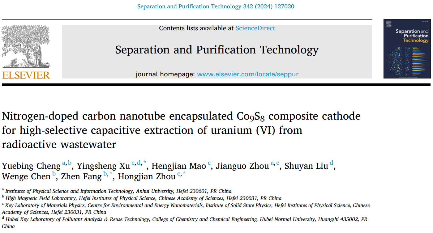 从核废水中选择性电吸附U(VI)对消除有害放射性辐射与资源回收具有重要意义。基于纳米限域效应,开发了一种氮掺杂碳纳米管封装的Co9S8复合材料(CS-NCNT),实现了高效选择性U(VI)电吸附。该工作以“Nitrogen-doped carbon nanotube encapsulated Co9S8 composite cathode for high-selective capacitive extraction of uranium (VI) from radioactive wastewater”为题发表在Separation and Purification Technology(《分离纯化技术》)。bv1946伟德徐应生博士、中国科学院强磁场科学中心房震研究员、固体物理研究所周宏建研究员为共同通讯作者,bv1946伟德为通讯单位之一。Separation and Purification Technology是Elsevier(爱思唯尔)出版社旗下工程技术领域期刊、SCI中科院大类一区期刊,最新影响因子为8.1。