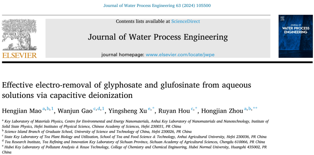 草铵膦(Gly)和草甘膦(Glu)都是常用的除草剂,其对环境和人类健康的影响引发担忧。通过原位电氧化与电容吸附的有效结合,碳基CDI技术实现了对水体中除草剂的分解和去除。该工作以“Effective electro-removal of glyphosate and glufosinate from aqueous solutions via capacitive deionization”为题发表在Journal of Water Process Engineering(《水处理工程杂志》)。bv1946伟德徐应生博士、安徽农业大学侯如燕教授、中科院合肥研究院周宏建研究员为论文共同通讯作者,bv1946伟德为通讯单位之一。Journal of Water Process Engineering是Elsevier(爱思唯尔)出版社旗下工程技术领域期刊、SCI中科院大类二区期刊,最新影响因子为6.3。