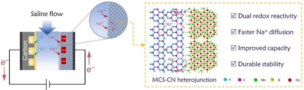 2. High-capacity and high-stability capacitive desalination with dual redox-active MnCo2S4/g-C3N4 heterojunction electrode