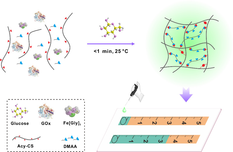 即时(POC)检测凸显了便携、经济、可视化定量生物标志物等优势。在该项工作中,研究团队成功开发了一种由测试液和测试条组成,基于靶标触发超快凝胶化的POC生物传感器。在凝胶化过程中,靶标触发氧化酶和甘氨酸亚铁协同催化级联反应,高效产生碳自由基,并迅即引发丙烯酰化硫酸软骨素和二甲基丙烯酰胺的超快聚合交联,从而在25 ºC条件下1分钟内即可完成软骨素水凝胶的生成。基于水凝胶形成后溶液的粘度变化,结合不同粘度溶液在刻度标记试纸条上的不同扩散行为,便能实现靶标的可视化快速定量分析。利用葡萄糖氧化酶作为凝胶化过程中的氧化酶模型,该POC传感器无需任何辅助仪器即成功用于葡萄糖的快速定量检测。得益于酶促聚合反应的特异性和稳定性,该传感器在临床血液样本的葡萄糖检测中表现出优异性能。此外,该传感器还进一步用于尿酸检测,并能在临床尿液样本中实现精确的尿酸测定,表明该传感器具有较强的实用性和拓展性。