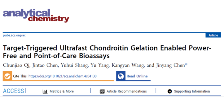 近日,国际知名期刊Analytical Chemistry(《分析化学》)在线发表了公司陈金阳副教授团队在生物传感领域的最新研究成果。论文题为“Target-Triggered Ultrafast Chondroitin Gelation Enabled Power-Free and Point-of-Care Bioassays”(靶标触发超快软骨素凝胶化实现无电即时生物检测)。2022级硕士研究生齐春娇为论文第一作者,陈金阳副教授为论文通讯作者,bv1946伟德为论文唯一通讯单位。Analytical Chemistry是American Chemical Society(美国化学会)出版社旗下分析化学领域顶级期刊,中科院SCI化学大类一区期刊、自然指数期刊,最新影响因子为6.7。