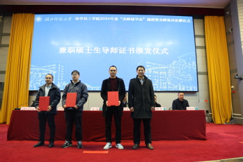 经理殷国栋代表学院及全体受助员工,将致信美峰集团合集《感恩有你》回赠美峰集团。余涛为湖北美峰技术有限公司总经理曾诚、黄冈美丰化工科技有限公司总经理刘建军、黄冈美丰化工科技有限公司副总经理徐文立等三位高管颁发兼职硕士生导师聘书并合影留念。