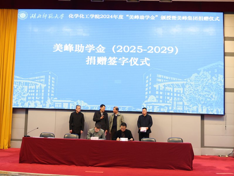 余涛与曾铁鸣共同为2023年获资助的在校9名同学颁授证书、为2024年获资助的10名同学颁发助学金及证书。根据2020年设立“美峰助学金”协议,第一期“美峰助学金”已满五年,学院共50人次在校期间获得资助,其中已有26名受助员工顺利完成学业,9名毕业生顺利考上硕士研究生继续深造。为了庚续回馈母校、捐资助困的企业社会责任,曾铁鸣董事长及美峰集团经研究,决定继续设立“美峰助学金”并扩大资助额度和范围,在未来五年面向bv1946伟德贫困学子,捐赠50万元用于资助100名品学兼优的贫困学子。会上,美峰集团代表、湖北美峰化学有限公司总经理柯生辉、bv1946伟德教育发展基金会秘书长、员工工作处处长刘洋,分别代表美峰集团及bv1946伟德教育发展基金会签订捐赠协议。