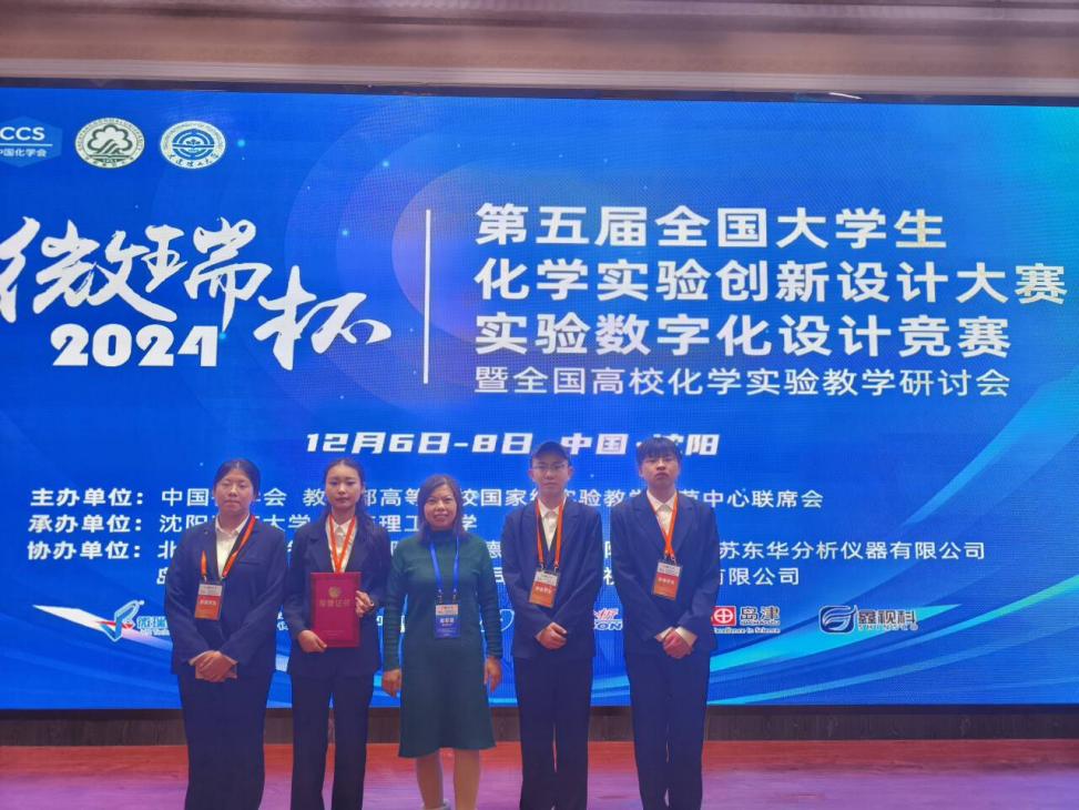 第五届全国老员工化学实验创新设计大赛-实验数字化设计竞赛于12月6-8日在沈阳师范大学举行,赛事由中国化学会、教育部高等学校国家级实验教学示范中心联席会主办,沈阳师范大学和大连理工大学联合承办。公司化学专业2202班饶玉、高佳丽、周奇、刘尧及计算机与信息工程学院通信工程专业2105班邢亮5名同学组建的bv1946伟德三队通过激烈角逐进入全国总决赛,获得全国二等奖,指导老师为公司物理化学教研室程翠霞副教授和计算机与信息工程学院黄琳老师。