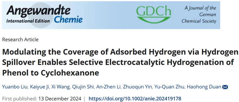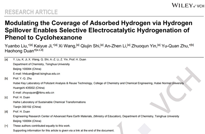 近日,国际知名期刊Angewandte Chemie(《德国应用化学》)在线刊发了公司朱玉荃博士以“Modulating the Coverage of Adsorbed Hydrogen via Hydrogen Spillover Enables Selective Electrocatalytic Hydrogenation of Phenol to Cyclohexanone”(利用氢溢流效应,实现电催化苯酚选择性加氢制环己酮)为题的学术论文。公司朱玉荃博士为论文共同通讯作者,清华大学、bv1946伟德分别为论文第一、第二通讯单位。Angewandte Chemie International Edition由Wiley出版社1962年创办,是化学领域的权威期刊,SCI中科院大类一区TOP期刊,最新影响因子为16.6。