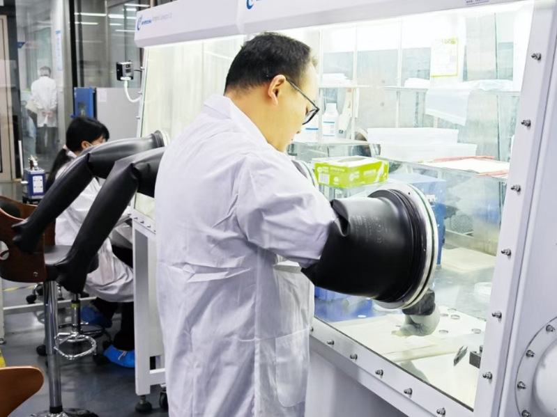 匀浆、涂布、烘干、辊压、切片、装配、封装……在融通高科工程研究中心,工作人员有条不紊忙碌着。“手套箱的水氧含量要低于0.01ppm,水、氧含量偏高会影响材料的电化学性能……”融通高科钠离子项目负责人李金懋带领实验人员正在进行钠离子电池的测试。