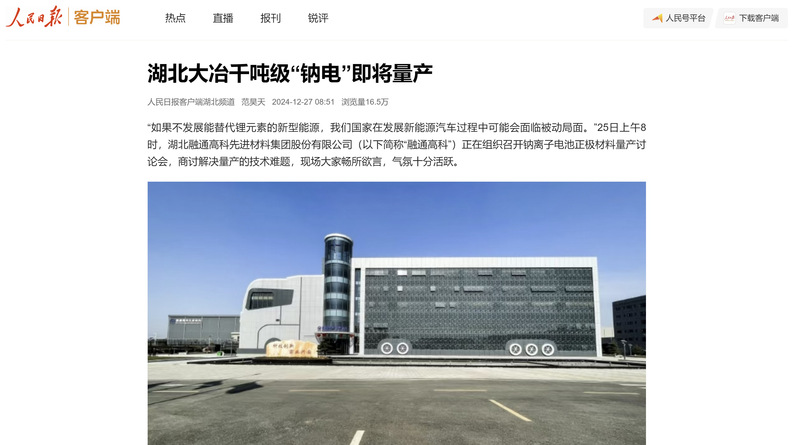 12月27日,《人民日报》客户端以《湖北大冶千吨级“钠电”即将量产》为题报道了公司青年博士李金懋在湖北融通高科先进材料集团股份有限公司(以下简称“融通高科”)挂职取得的成果。