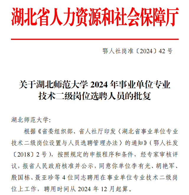此前,根据《省委组织部、省人社厅印发〈湖北省事业单位专业技术二级岗位设置与人员选聘管理办法〉的通知》(鄂人社发〔2018〕2 号),学校按照规定的申报程序和条件组织了初审。经省人社厅组织专家审核评议,报省人民政府核准并公示,公司含胡艳军教授、殷国栋教授在内共4名教授晋升为二级教授。