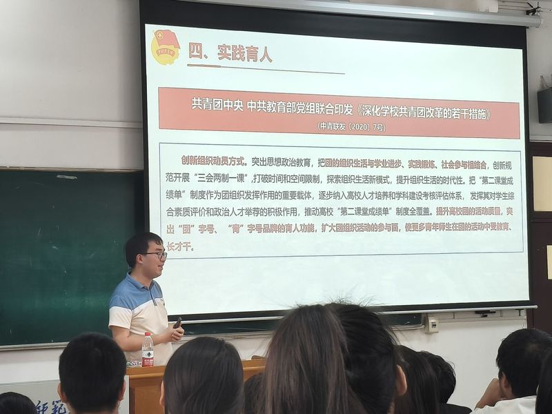 开班仪式结束后,郭先哲以《高校共青团的组织架构与重要使命》为题进行第一次集中授课。他介绍了高校团组织的架构,并结合《中国共产主义青年团普通高等学校基层组织工作条例》讲述了高校团组织的主要职责与工作任务。随后重点从团员组织关系的管理、规范发展团员与管理、团费收缴工作和团员教育工作四个方面讲述了团组织的基础团务实务与思想引领功能。最后,他从实践育人角度,讲述了校院两级团组织将团的组织生活与学业进步、实践锻炼、社会参与相结合的若干实践。并对如何开展好一次员工活动进行了详细介绍。