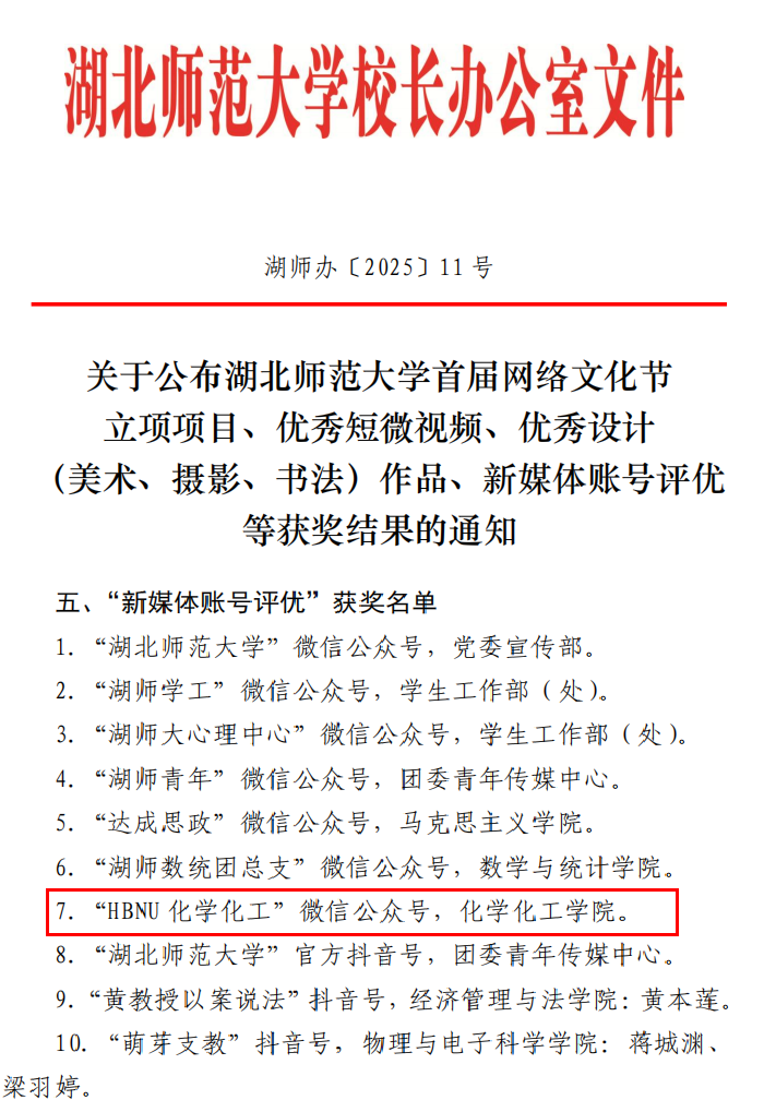 近日,学校发布《关于公布bv1946伟德首届网络文化节立项项目、优秀短微视频、优秀设计(美术、摄影、书法)作品、新媒体账号评优等获奖结果的通知》(湖师办〔2025〕11号),学院官微“HBNU化学化工”获十大新媒体优秀账号。