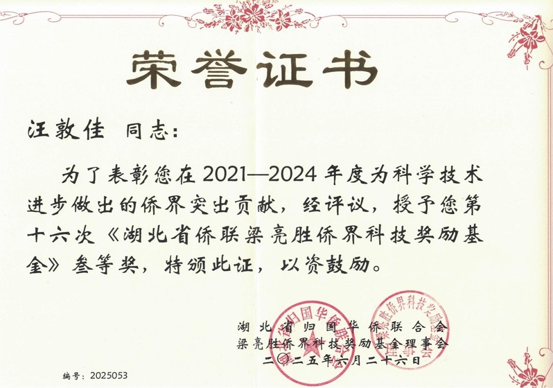湖北省侨联“梁亮胜侨界科技奖励基金”由香港实业家、省侨联荣誉主席、丝宝集团董事长梁亮胜于1994年设立,主要用于奖励对科学技术事业作出重大贡献的湖北省归侨、侨眷、侨属、港澳同胞及眷属,是全国省级侨联设立最早、影响最大的科技奖励基金之一,每两年评选一次。今年评出的第16次“湖北省侨联梁亮胜侨界科技奖励基金”从2021年至2024年获得省部级以上科技奖励的侨届项目负责人中产生,共评出54人,其中一等奖1人、二等奖20人、三等奖33人。7所省属高校的15名专家获奖,汪敦佳教授是唯一一名武汉地区高校以外的获奖专家。