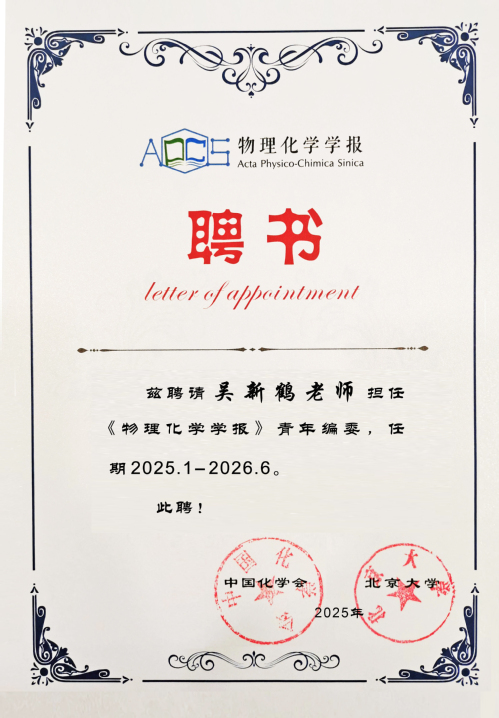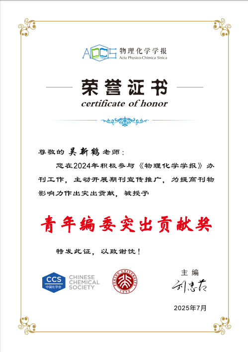 吴新鹤博士于2025年1月受聘为《物理化学学报》青年编委,聘期1.5年。《物理化学学报》(Acta Physico-Chimica Sinica) 是由北京大学和中国化学会联合主办的、代表中国物理化学领域最高学术水平的中文核心期刊之一。致力于发表物理化学各分支领域具有原创性和重要意义的基础与应用研究成果,在国内外学术界享有很高声誉,是SCI收录期刊,也是中国物理化学研究者重要的学术交流平台,最新影响因子为13.5,是中科院二区、JCR一区期刊。