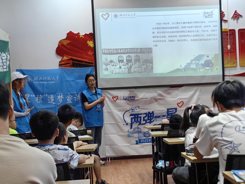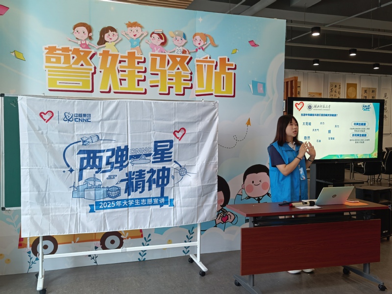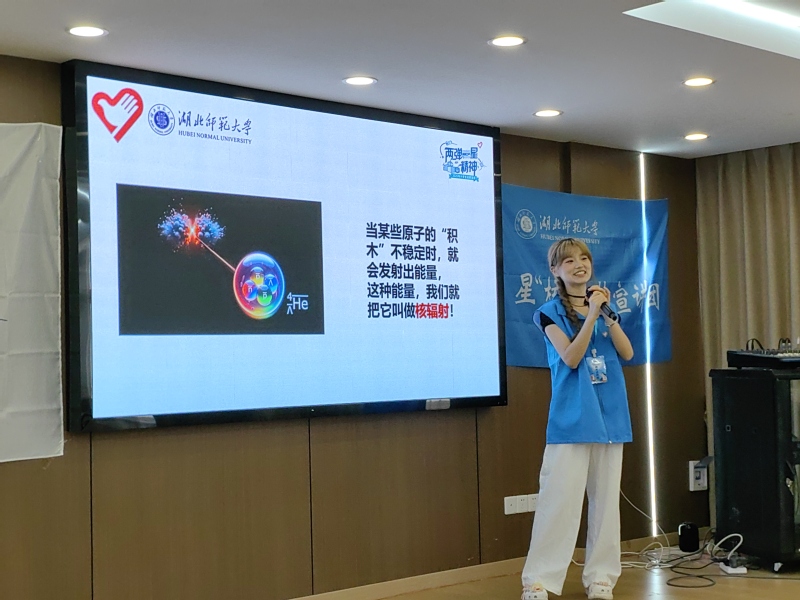 7月14日,宣讲团成员郭堃炜走进黄石市警娃驿站开展宣讲。她从“两弹一星”的历史背景切入,用动画短片展示了原子弹研发时科研人员在艰苦环境中攻坚克难的故事,接着用“小太阳的能量”作比喻,讲解了核能的基本原理,还通过对比煤炭、水电等能源,说明了核能的特点。宣讲中特别设置了“核能小实验”互动环节,孩子们用简易装置模拟核裂变链式反应,在动手操作中理解能量传递的过程;“科学问答竞赛”则围绕研发故事和核能知识展开,答对的小朋友获得了科普绘本奖励。这些环节引导听众既感受到科研工作者的爱国精神和奉献精神,也对核能的科学原理及安全利用有了直观认识,在心中种下崇尚科学、热爱祖国的种子。
