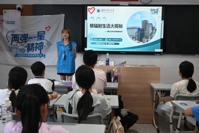 7月12日,宣讲团成员王宇欣、金萧宇走进浠水县华桂中学,为六升七、七升八年级员工带来一堂有趣生动的宣讲。金萧宇以“什么是核能?”为切入点,通过原子弹、氢弹等员工熟悉的例子,深入浅出地讲解了核能的基本原理及其在国防与民生中的重要作用。他从中国核工业的起步、发展里程碑、重大科技成果等方面展开,在一个个故事中带领同学们穿越“三个30年”,回顾了我国核工业从无到有、从弱到强的辉煌历程,鼓励大家树立科技报国的远大理想。王宇欣则从“核辐射是什么”“核辐射从哪儿来”“辐射的测量与防护”“常见的放射性元素与核技术的应用”四个方面进行了讲解。她用“能量粒子的旅行”比喻阐释核辐射本质,结合示意图说明原理;列举土壤中的铀、空气中的氡等天然辐射源,以及医疗检查等人工辐射场景;介绍距离防护、屏蔽防护等方法;还通过核医学治疗、食品辐照保鲜等案例展现核技术应用。