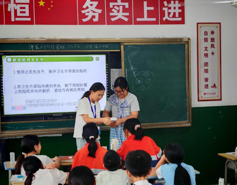 支教老师宗庭竹和员工一起演示卫生巾的正确使用方法
