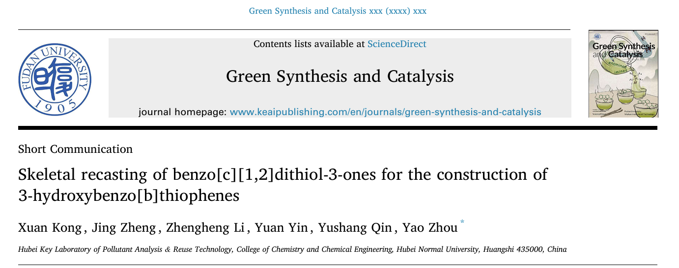 近日,国际知名期刊Green Synthesis and Catalysis(《绿色合成与催化》)在线发表了化工工艺教研室周耀副教授在分子骨架编辑领域的最新研究成果。论文题为“Skeletal recasting of benzo[c][1,2]dithiol-3-ones for the construction of 3-hydroxybenzo[b]thiophenes”(苯并二磺酚酮的骨架重组构建3-羟基苯并噻吩)。公司2023级硕士研究生孔暄为论文第一作者,周耀博士为论文通讯作者,bv1946伟德为论文唯一通讯单位。Green Synthesis and Catalysis是ELSEVIER(爱思唯尔)出版社旗下绿色合成与催化领域期刊、中科院大类一区期刊,最新影响因子为6.3。