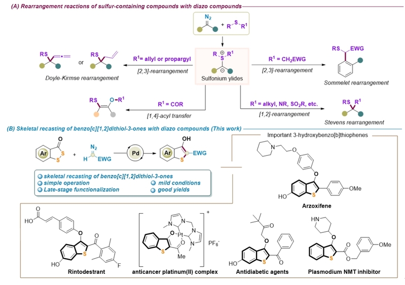分子骨架编辑作为自然界创造活性天然产物结构多样性的重要合成工具,如果能对杂环及碳环的核心骨架进行直接编辑,比如消除、替换或者插入特定的原子,则可能改善或者完全改变分子的理化性质、生物活性及药代动力学特征,为药物活性分子的开发提供强劲的合成策略。卡宾和氮宾因其独特的高反应活性,已成为实现分子骨架精准编辑的高效合成子。然而,迄今为止,卡宾介导苯并二磺酚酮的分子骨架编辑反应尚未见文献报道。针对这一研究空白,周耀博士研究团队首次开发了钯催化卡宾介导苯并二磺酚酮分子骨架编辑的新方法。该研究利用重氮化合物作为卡宾前体,实现了苯并二磺酚酮的S→C的原子交换反应,在温和的条件下合成一系列官能团化的3-羟基苯并噻吩衍生物。