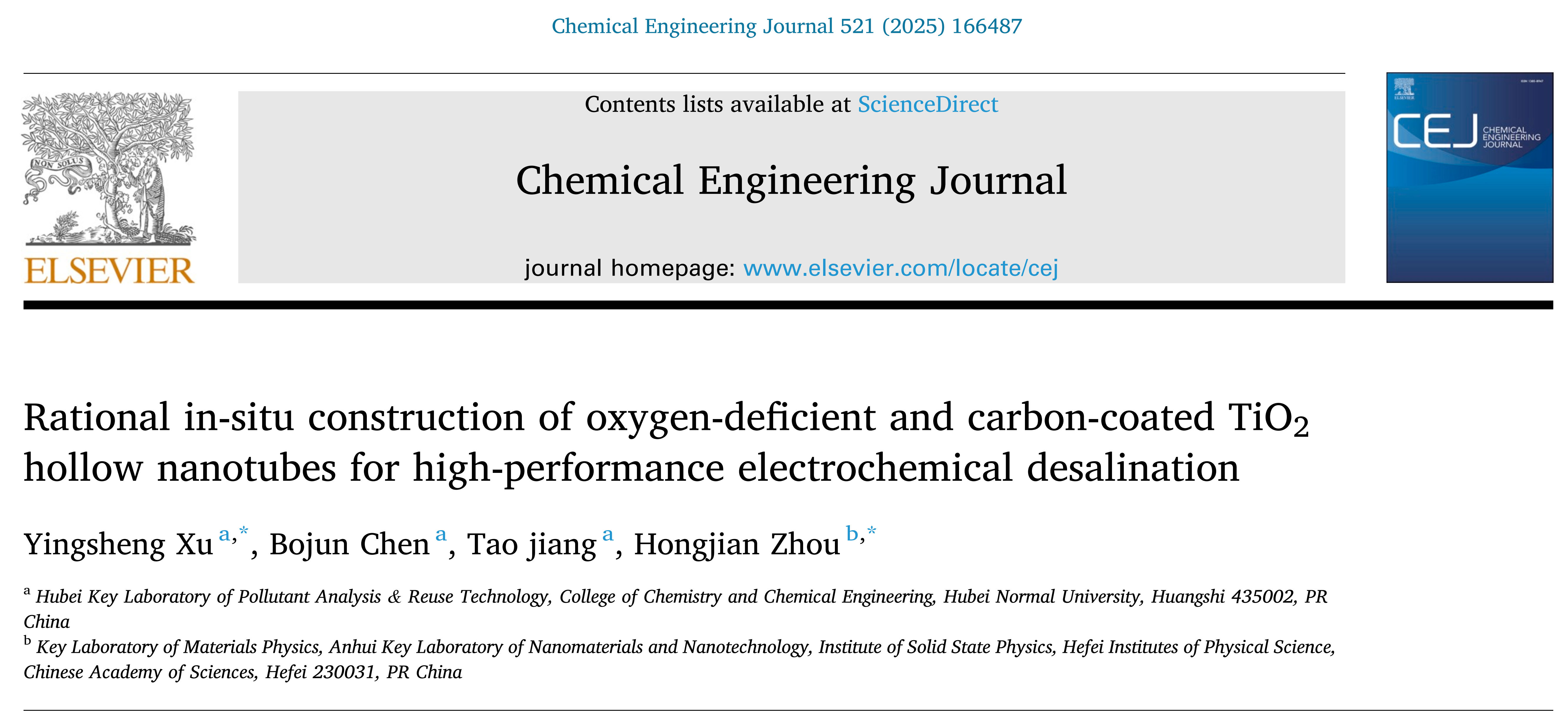 近日,国际知名期刊Chemical Engineering Journal(《化学工程杂志》)在线发表了物理化学教研室徐应生博士团队在电化学脱盐领域的最新研究成果。论文题为“Rational in-situ construction of oxygen-deficient and carbon-coated TiO2 hollow nanotubes for high-performance electrochemical desalination”(《原位构筑高性能碳包覆氧空位TiO2中空纳米管电极用于高效脱盐》)。徐应生博士为论文第一作者兼通讯作者,中科院合肥物质研究院周宏建研究员为论文共同通讯作者,实验与数据处理部分由课题组2022级本科生陈伯骏(论文第二作者)完成,bv1946伟德为论文第一通讯单位。Chemical Engineering Journal是ELSEVIER(爱思唯尔)出版社旗下材料科学领域TOP期刊、SCI中科院大类一区,最新影响因子为13.2。