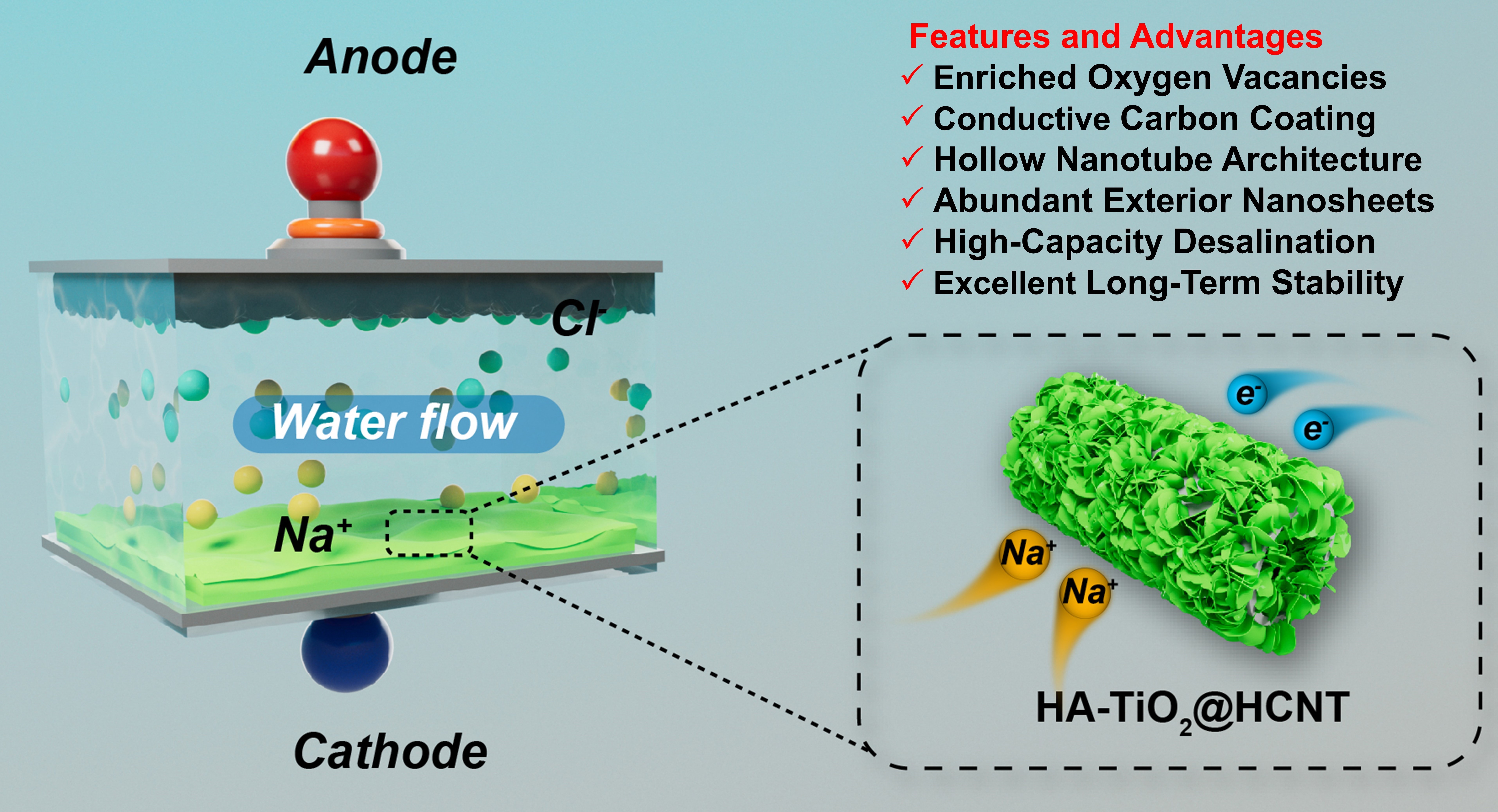 在全球淡水资源匮乏背景下,海水淡化成为应对饮用水需求增长的关键途径。电容去离子(CDI)因其低能耗、操作简便及无有害化学添加剂,被认为是极具吸引力的脱盐新方案。然而,CDI在脱盐容量与长期稳定性两方面仍需大幅提升。该研究设计并制备了一种具有丰富氧空位和均匀碳包覆的分级空心TiO2纳米管电极(HA-TiO2@HCNT),通过溶剂热处理与气相还原法实现。氧空位、碳涂层以及空心纳米管与外部纳米片结构的协同作用,使该材料展现出优异的脱盐性能,脱盐量高达40.24 mg·g-1,脱盐速度达1.32 mg·g-1·min-1,并在激活后经300次循环仍保持出色的稳定性。表面价态分析与理论计算揭示了氧空位和赝电容行为在TiO2电化学脱盐过程中的关键作用,凸显了HA-TiO2@HCNT作为高性能电极在电化学脱盐应用中的巨大潜力。该研究为理性设计高性能金属氧化物电极材料在高效、长寿命电化学脱盐领域的应用提供有益指导。