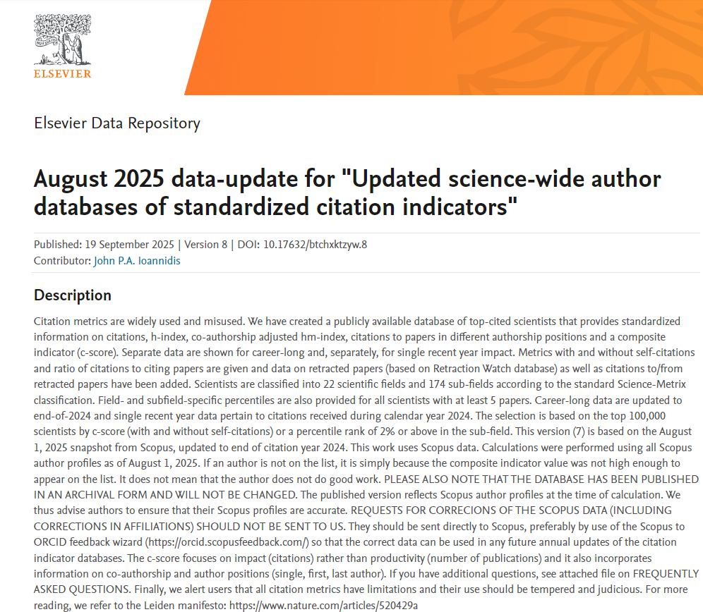 完整榜单请见:https://elsevier.digitalcommonsdata.com/datasets/btchxktzyw/8