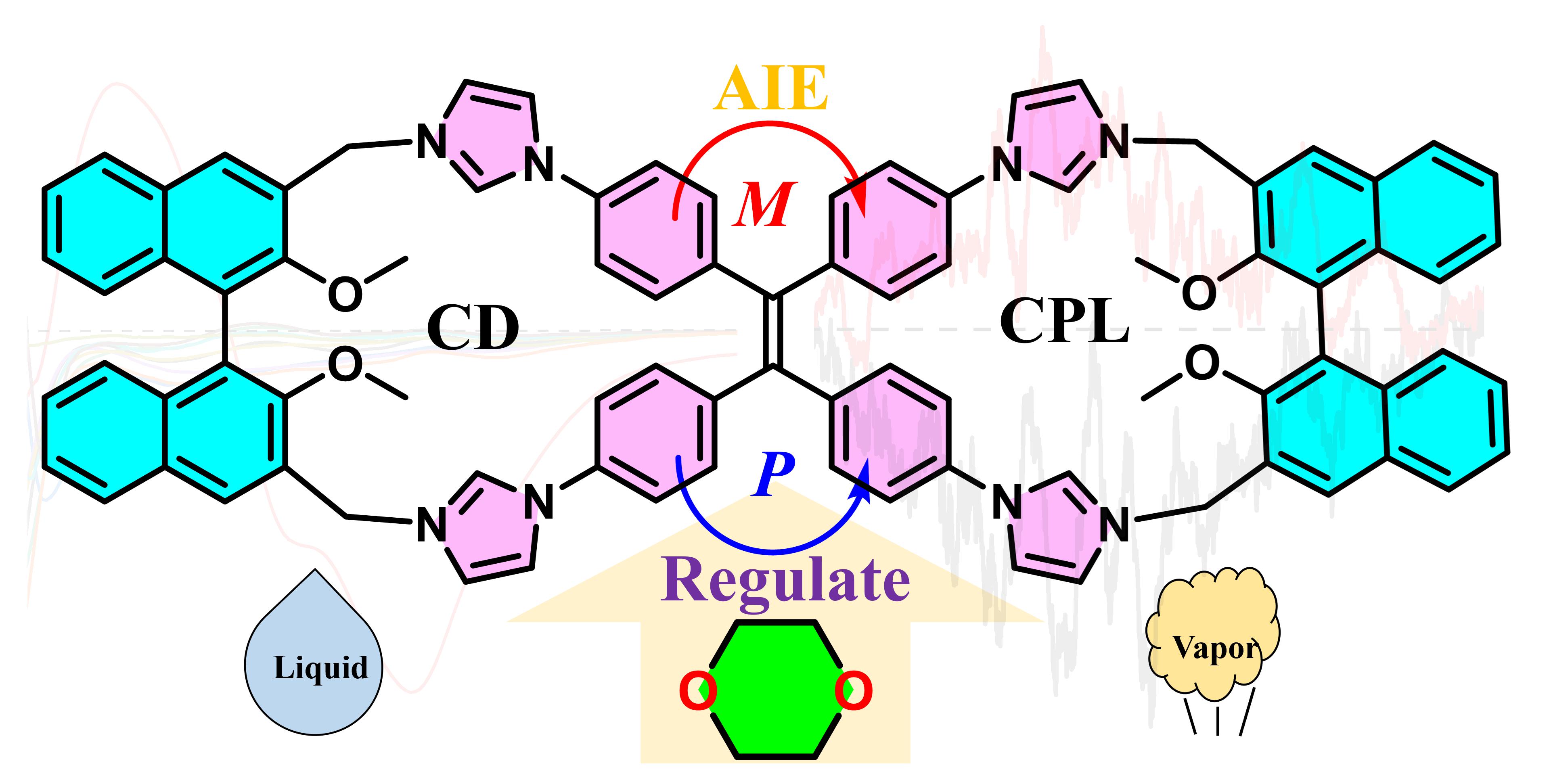 手性大环化合物因其包含手性中心元素或固有分子不对称性,已成为超分子化学和手性光物理领域的关键研究平台。这类大环化合物在对映选择性分子识别、不对称催化及圆偏振发光(CPL)材料开发等领域获得广泛应用。手性大环独特的三维拓扑结构与不对称微环境使其能够精准调控CPL行为,为高性能CPL系统提供了普适性设计策略。该领域的一个重要前沿方向是开发刺激响应型CPL材料,其中通过溶剂诱导结构重排来调控大环体系手性构型与光学输出的实例仍较为少见。在这项研究中,他们合成了一对手性咪唑盐双大环发光体(R,R)-IBM和(S,S)-IBM。二者在1,4-二氧六环中表现出显著的聚集诱导(AIE)荧光增强效应,量子产率提升6倍,并具备独特的CPL活性(|glum|=8.92×10-4)。圆二色(CD)光谱测试表明,在1,4-二氧六环/乙腈混合溶剂的聚集过程中,手性光学信号呈现分步反转现象,对应四苯乙烯(TPE)核心的构象转变(P→M→P)。X射线单晶衍射和密度泛函理论(DFT)计算进一步佐证了上述结构变化。固态下,(R,R)-IBM呈现P构型的TPE骨架,而暴露于1,4-二氧六环蒸汽后会引发CD响应反转,并进一步增强荧光效率。这种溶剂调控的可逆手性光学开关机制,为设计动态CPL活性材料提供了可靠策略,在光学数据存储、防伪技术及下一代光子器件领域展现出广阔应用前景。