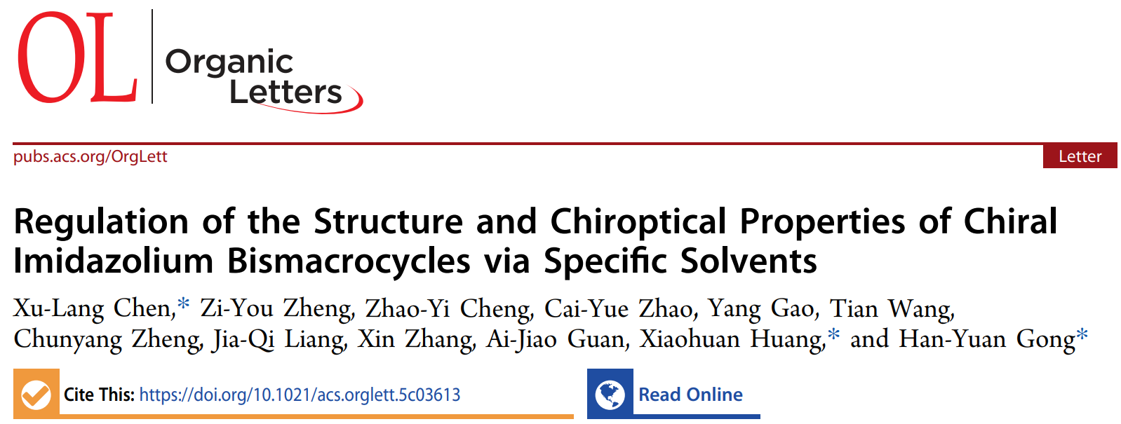 近日,Organic Letters(《有机化学通讯》)在线发表了公司有机化学教研室陈绪朗博士的最新研究成果。论文题目为“Regulation of the Structure and Chiroptical Properties of Chiral Imidazolium Bismacrocycles via Specific Solvents”(通过特定溶剂调控手性咪唑盐双大环的结构与手性光学性质)。陈绪朗博士为论文第一作者兼通讯作者,有机化学教研室黄小欢教授和北京师范大学龚汉元教授为论文共同通讯作者,bv1946伟德为论文第一通讯单位。Organic Letters是American Chemical Society(美国化学会)出版社1999年起发行的国际期刊,主要报道有机化学方面的最新研究进展,是中科院一区top期刊、自然指数(Nature Index)期刊,最新影响因子为5.0。