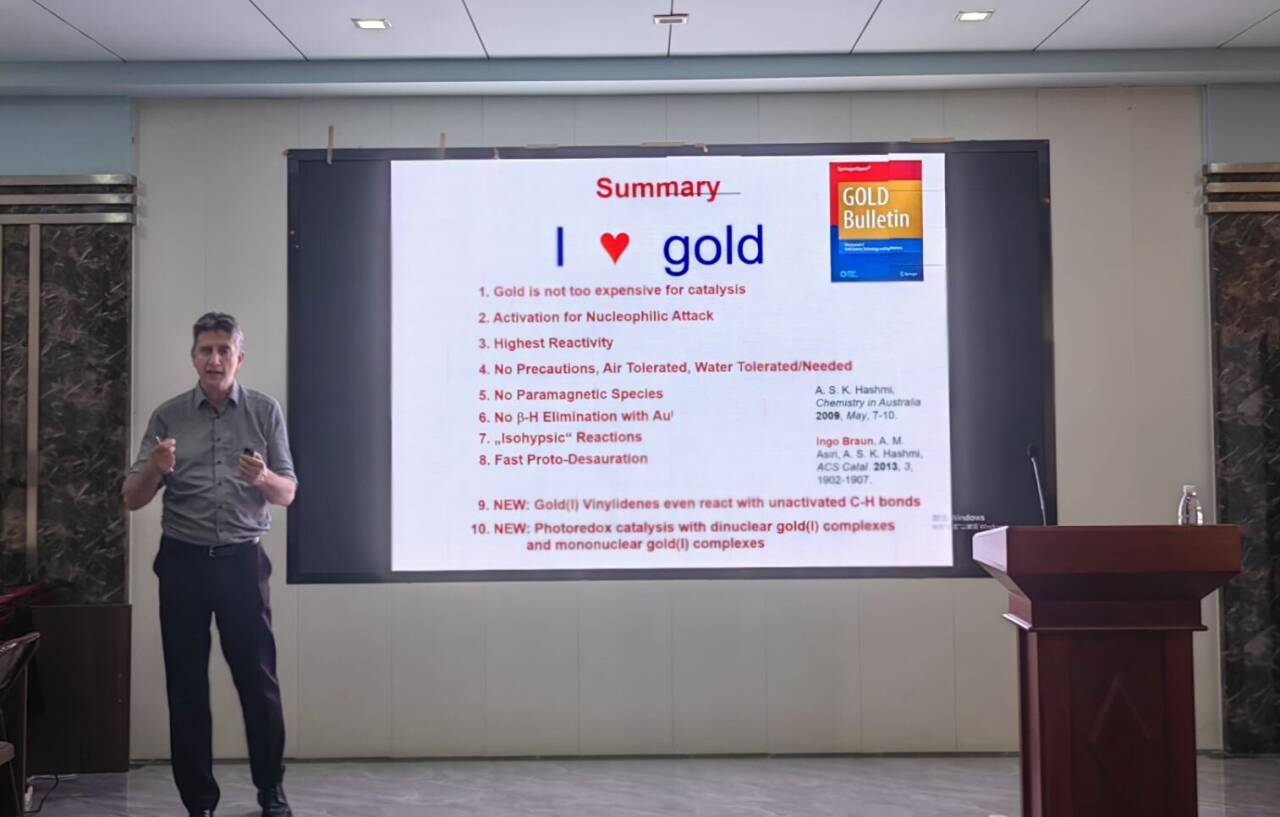 Hashmi教授以“时间轴”式梳理,系统概述了金催化领域的发展历程,指出了金催化体系具有操作简便、对水和氧气耐受等天然优势,因而受到了科研工作者的极大关注。随后,Hashmi教授聚焦金催化的“机理-应用”双维度,系统性地讲述了金催化模型及其在材料科学中的应用,深入浅出地介绍了课题组近年来在该领域取得的代表性科研成果。
