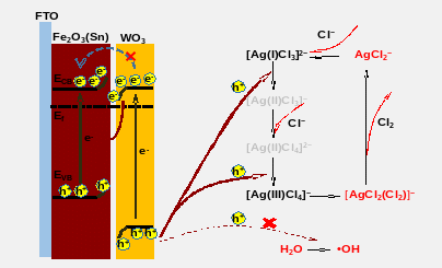 结合原位与非原位表征分析发现,WO3层不仅作为抗腐蚀保护层,更与Fe2O3(Sn)核构筑了Z型异质结,有效促进了光生空穴的注入。原位EPR和Raman光谱进一步揭示了反应机理:痕量Ag+有效抑制了竞争性的水氧化反应(及羟基自由基的生成),并通过[AgCl2(Cl2)]⁻均相中间体主导了空穴向Cl⁻的转移,从而实现了高选择性析氯。该工作为在酸性海水或含氯工业废水环境中同步实现高效光解水产氢与氯资源化利用,提供了一种稳定且实用的光阳极设计策略。