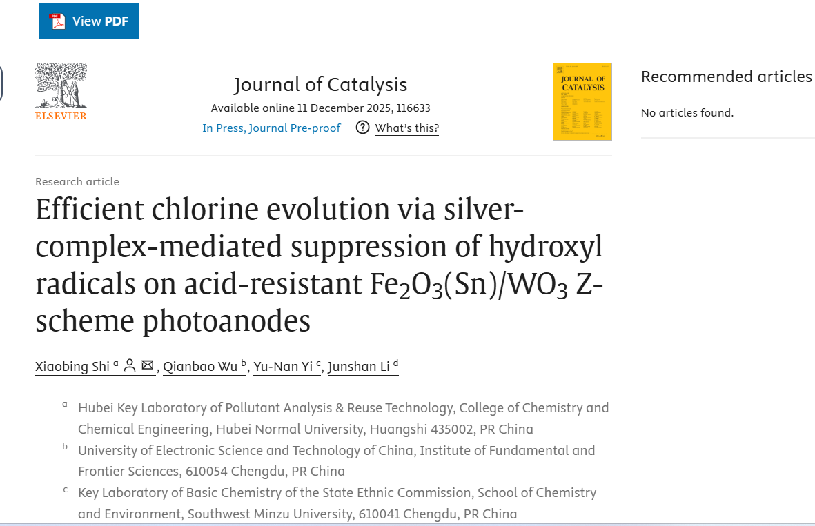 近日,Journal of Catalysis在线发表了公司化工教研室石小兵博士的最新研究成果。论文题目为“Efficient Chlorine Evolution via Silver-Complex-Mediated Suppression of Hydroxyl Radicals on Acid-Resistant Fe2O3(Sn)/WO3 Z-Scheme Photoanodes”(利用银配合物介导抑制羟基自由基在耐酸Fe2O3(Sn)/WO3 Z型光阳极上实现高效析氯)。石小兵博士为论文第一作者兼通讯作者,bv1946伟德为论文唯一通讯单位。Journal of Catalysis是Elsevier出版社1962年起发行的国际期刊,主要报道有催化方面的最新研究进展,是中科院一区top期刊,最新影响因子为6.5。