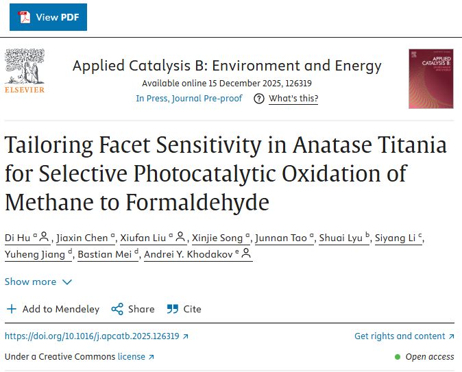 近日,Applied Catalysis B:Environment and Energy(《应用催化B:环境与能源》)在线发表物理化学教研室胡迪博士、刘修凡副教授与法国里尔大学Andrei Y. Khodakov教授等人合作的最新研究成果。论文题为“Tailoring Facet Sensitivity in Anatase Titania for Selective Photocatalytic Oxidation of Methane to Formaldehyde”(调控锐钛矿二氧化钛晶面敏感性实现光催化甲烷选择性氧化制甲醛)。胡迪博士为论文第一作者兼通讯作者,刘修凡副教授和Andrei Y. Khodakov教授为共同通讯作者,bv1946伟德为论文第一通讯单位。Applied Catalysis B:Environment and Energy是环境与能源催化领域国际顶级期刊、中科院一区Top期刊,最新影响因子为22.1。
