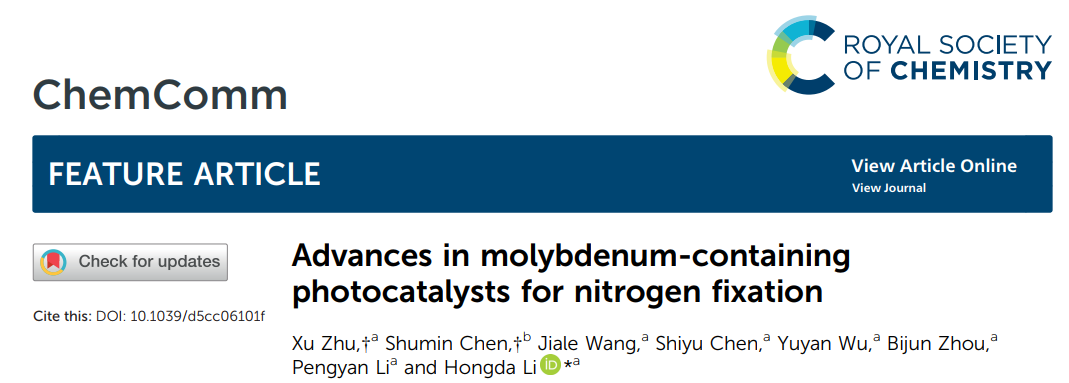 2025年12月,Chemical Communications(《化学通讯》)在线发表了该团队在光催化固氮领域的研究综述,论文题为“Advances in Molybdenum-Containing Photocatalysts for Nitrogen Fixation”(含Mo光催化固氮催化材料的研究进展)。李宏达博士为论文唯一通讯作者,bv1946伟德为论文第一通讯单位,应用化学专业2305班本科生朱旭与荆楚理工学院陈淑敏教授为论文共同第一作者。Chemical Communications是自然指数期刊、中科院二区TOP期刊,最新影响因子为4.2。